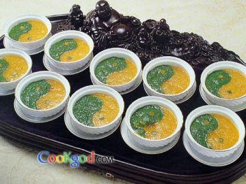 2、将自制绿糊、南瓜蓉分别调好,用模具装入放有血燕、官燕的碗上,摆成太极造型即成。
