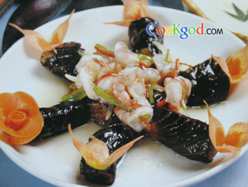 3、虾仁汆水,炒勺留底油,葱、姜炝锅,放入老汤,加盐、味精、糖少许,酱油调味后,放入炸好的茄段和虾仁,烧至入味,用淀粉勾芡出勺摆盘。