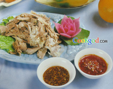 3、然后将剔下的肉切成块状堆在骨头上,用酱油、芝麻油、蒜泥、红油、香菜调合成汁,食时蘸着酱汁吃。