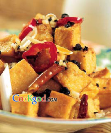 香辣可口,开胃下酒。炸过的豆腐容易吸汁,炒制时可加一点高汤或清水,以免菜肴过干。