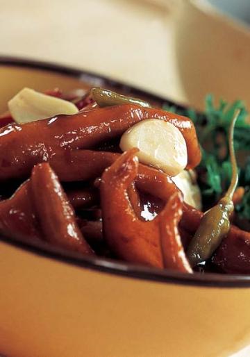 4、上桌时用泡椒段勾芡,浇在熟鸭上即成。