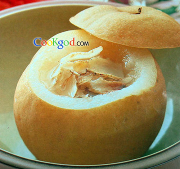 2、将盅放入锅内,加3杯水,隔水炖熟即可食用,食用时可饮汤食梨。