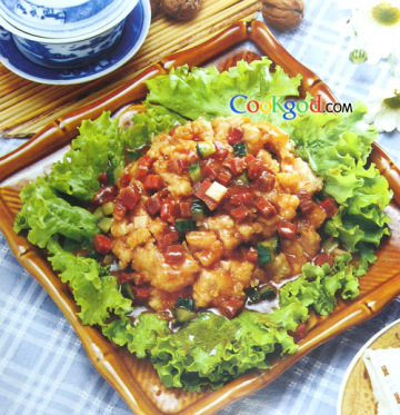 (4)把炒勺放旺火上烧热后,倒入熟大油,热后放入黄瓜、玉兰片、火腿丁,翻炒几下,倒入芡汁,待熟后,倒在盘中码好的里脊肉片上即可。