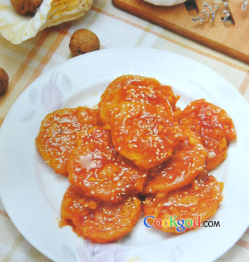 3、炒锅注油烧至四五成热,将西红柿两面蘸上面粉,再蘸匀鸡蛋液,逐片下入油锅中,将两面均炸成金黄色。锅中放入葱末、姜末、鸡汤、精盐、白糖,盖上锅盖,旺火烧开,放入炸西红柿片,改小火煨片刻,加入料酒,当汤汁收干时,淋入芝麻油,入盘,撒上芝麻即可。