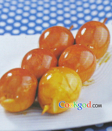 2、将鸡蛋串取出摆在熏箅上,上熏锅用白糖熏3分钟,取出抹上一层香油即成。