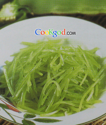 2、将切好的青笋丝盛入盘中,加入精盐1/2小匙,味精1/2小匙,葱油2小匙拌均匀即成。