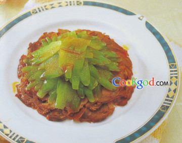 3、花椒中加红油、味精拌匀,浇在苦瓜上,将苦瓜摆在熟牛腱肉片上即可。
