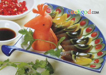 2、取扇形盘,先摆青瓜,再摆皮蛋,最后放上“孔雀头”;