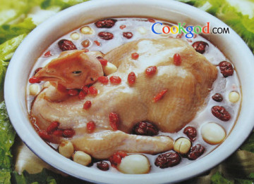 原材料老母鸡1只,红枣、枸杞、桂圆、莲子各20克,鹌鹑蛋5个调味料白糖、姜片、葱段各15克,味精、盐各10克