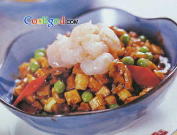 3、虾仁滑油至熟,青豆汆水至熟,盖在酱丁面上即成。