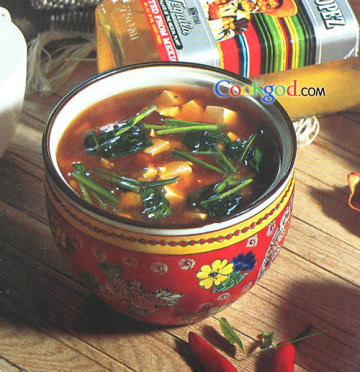3、炒锅上火烧热,加底油,用葱、姜末、花椒面炝锅,烹绍酒,添汤,加入豆腐、胡萝卜、海米、酱油、精盐调好口味,烧开,撇去浮沫,加味精,用水淀粉勾薄芡,撒上菠菜段,出锅装碗即可。
