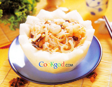 3.坐锅点火倒油,油热放入鱿鱼丝、香菇丝、猪肉丝、虾仁、粉丝、鸡精,翻炒均匀倒入冬瓜中,放入蒸锅中加高汤蒸15分钟时加入盐,再蒸5分钟即可出锅。