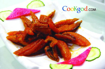 1、鳗鱼去骨切片,下盐5克、味精5克、料酒10克,腌制半小时后入七成热油中小火炸至金黄色。