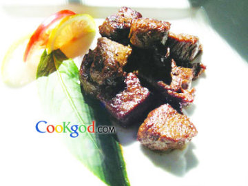 (2)烧锅中加生油,用大火煎至牛柳外金黄内熟,取出。