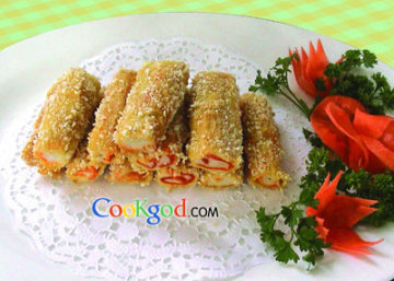 4.热油锅,将油温烧热至约120℃,放入作法3的土司卷油炸至表面呈金黄色,捞出沥干油脂即可。
