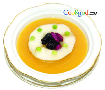 3、锅内加入桃汁,再加冰糖3克、蜂蜜调味,勾薄芡浇在蒸好的梨上,放入黑枣,点缀青豆即可。