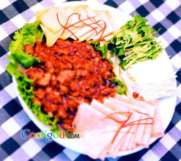 3、锅留底油,烧至六成热,下入酱黄大火炒香,放入葱花,下入牛柳丝、莴苣丝、花雕酒、海天老抽、味精、白糖大火翻炒均匀,勾薄芡装到盘中的生菜叶上,盘中放上葱丝、香菜段随加热的薄饼、豆腐皮上桌,客人可随个人口味用薄饼或豆腐皮卷食肉丝。