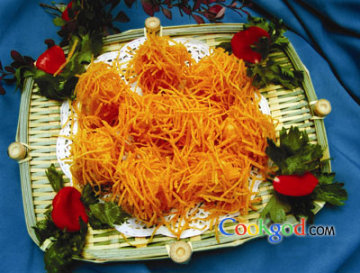 3、将调好的蒲菜鱼蓉挤成直径为6厘米的丸子,滚上土豆丝,放入烧至五成热的色拉油中小火浸炸3分钟至表面呈金黄色时捞出,控油装盘。