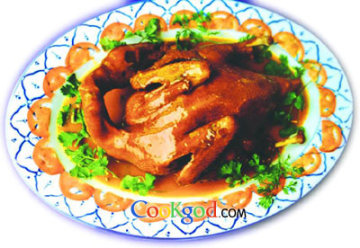 4、锅上火放色拉油烧至八成热,放鸭子小火炸至金黄色,再把卤锅放入八角、桂皮、香叶、盐烧沸10分钟后放入鸭子,小火卤20分钟捞出盛在盘中,覆上上述煸香后的配料,撒上胡椒粉上蒸锅旺汽蒸15分钟取出。