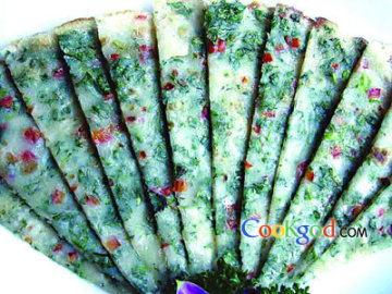 2、将香蜂花末、红椒粒放入稀糊中搅拌均匀;不粘锅内放入色拉油,烧至五成热时放入调好的稀糊小火煎3分钟后大翻勺,再用小火将另一面煎2分钟后出锅。