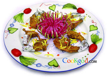 鲤鱼下巴450克,鲜菊花2克。调料盐4克,白糖4克,鱼露10克,生粉20克,鲜鸡蛋黄 20克,大蒜汁30克,葱花、青红椒粒10克,色拉油800克。