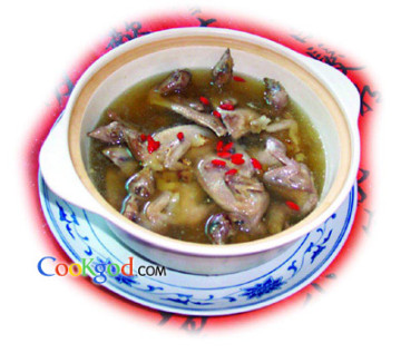 2、将鹌鹑、玉竹、枸杞子、葱结、姜块、火腿放入煲中,加水2000克,小火烧45分钟至鹌鹑将熟时放入精盐、味精、绍酒调味。