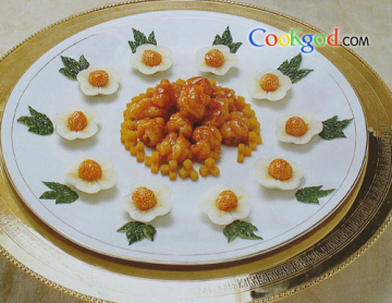 1、将大虾肉洗净后改刀,滑油,用杏汁、沙棘、汾酒炒制成熟。