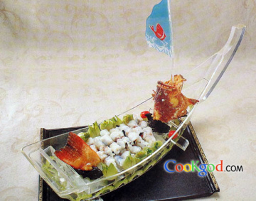 (2)将石斑鱼(连骨带尾)一起下油鼎炸至金黄色,熟透,摆砌在盘中。