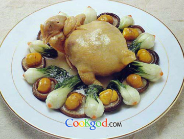 2、取部分板栗仁装入碗中,加少许盐、味精、湿生粉、生姜末、食用油、料酒,拌匀成锥后酿入鸡腹中,将鸡脖打结,放汤篮中,加高汤、生姜、生葱、料酒、盐、味精,上笼蒸40分钟后装盘。