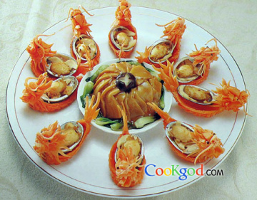 3、压好的鲍鱼用美极汁煎制,装入雕刻好的盘饰中,摆入盘中,菜胆摆放于中间,上面扣煨好的百灵菇即成。