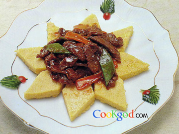 3、锅内放蚝油烧热,下入牛柳丝,调好口味,放在拼摆好的黄米上即成。