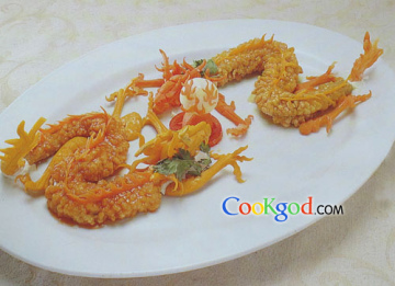 2、南瓜雕刻成龙头、龙爪和龙尾的形状,与炸好的鳝鱼拼摆成龙形,装盘,分别淋糖醋汁、西柠汁即成。