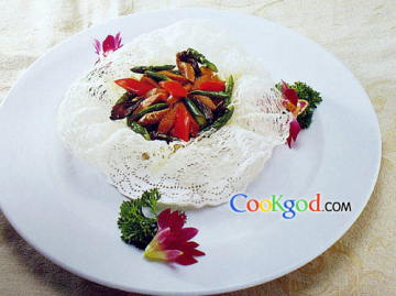 3、芦笋、白果、红椒与制好的鹅肝酱、牛肝菌一起炒熟,装入雀巢中即成。