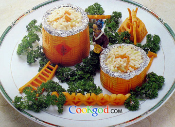 3、将以上原料调味炒好,装入雕刻好的粮仓形容器内即成。