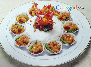 2、鸡爪汆水,加入鲍汁焖熟,分别装小碟内,围摆盘边。