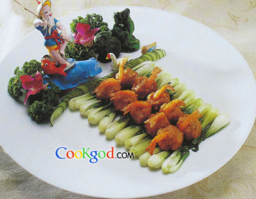 2、将五花肉剁碎,调味,包入河虾制成球状,入油锅炸成金黄色,盛入盘中焯好的菜胆上,浇汁即成。