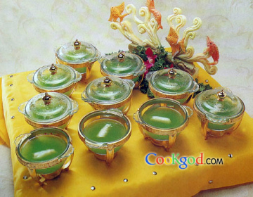 3、用清汤、黄瓜汁做成羹,分装入盛器中,放入鱼卷即成。