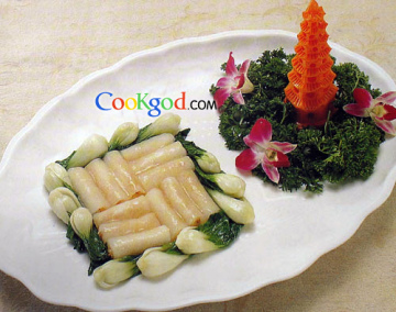 2、将三鲜卷入笼蒸熟,用油菜心围边,浇咸鲜汁,点缀即成。