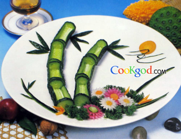 1.先用黄瓜雕几只竹节,挖空腹部,用开水烫一下后摆在盘中,配上竹叶。