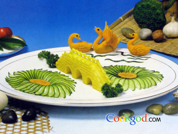 1.用牛腿瓜雕出一座小桥摆在盘中。