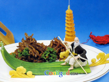 2.胡萝卜雕成古塔,摆在盘边,另将琥珀桃仁或干煸肉丝等菜肴堆在竹排一侧制成山峰即可。