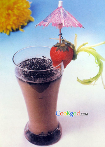 热红茶300毫升,黑芝麻10克,奶精粉9克,龙眼蜜50毫升,冰块120克