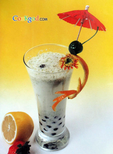 ①主料:清红茶120毫升,麦芽粉8克,特调奶精粉6克,糖水22毫升,冰块100克。②配料:黑珍珠粉圆30克,小菊花1朵,绿樱桃1个,小纸伞1把。
