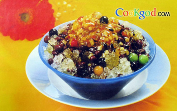 2、再撒上煮熟红小豆、珍珠粉圆、杂果碎,浇上桂花糖浆。