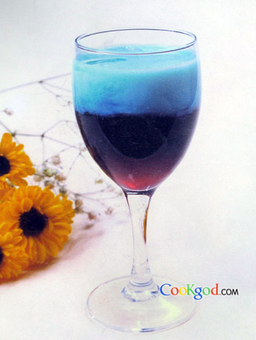 红石榴糖浆15毫升,干红葡萄酒20毫升,蓝莓汁30毫升,橙汁50毫升,牛奶100毫升,冰块100克