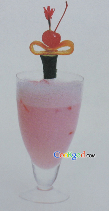 配方:草莓汁1盎司,鲜牛奶5盎司,草莓冰淇淋1小球,红石榴汁1/6盎司,糖水1/3盎司,冰块1杯