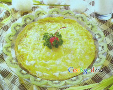 3、猛火烧锅,搪锅后改中火,放入蛋液混合物用慢火煎至两面金黄色,上碟即成。