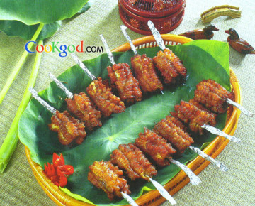 2、把拌好的肉末镶在竹扦上,沾上面包糠,入油锅炸熟。竹扦外包葱叶装饰。