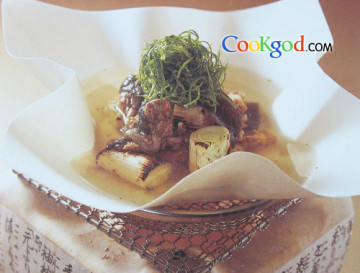 (5)将煮熟鳖肉及京葱放入纸锅内,轻轻注入鳖汤,配上菠菜丝。