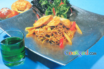 2、意大利细面用开水煮熟后捞出沥干,用黄油加蒜泥翻炒,最后加盐、胡椒调味。